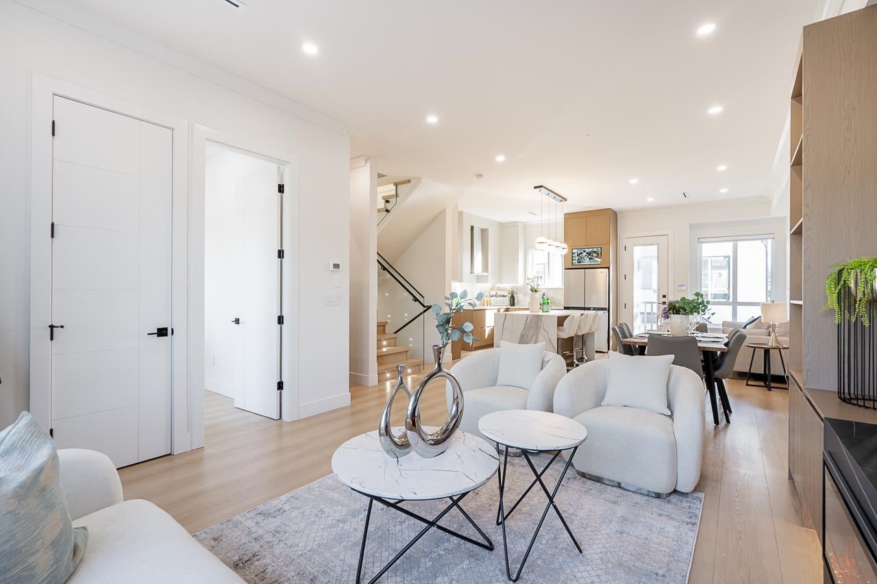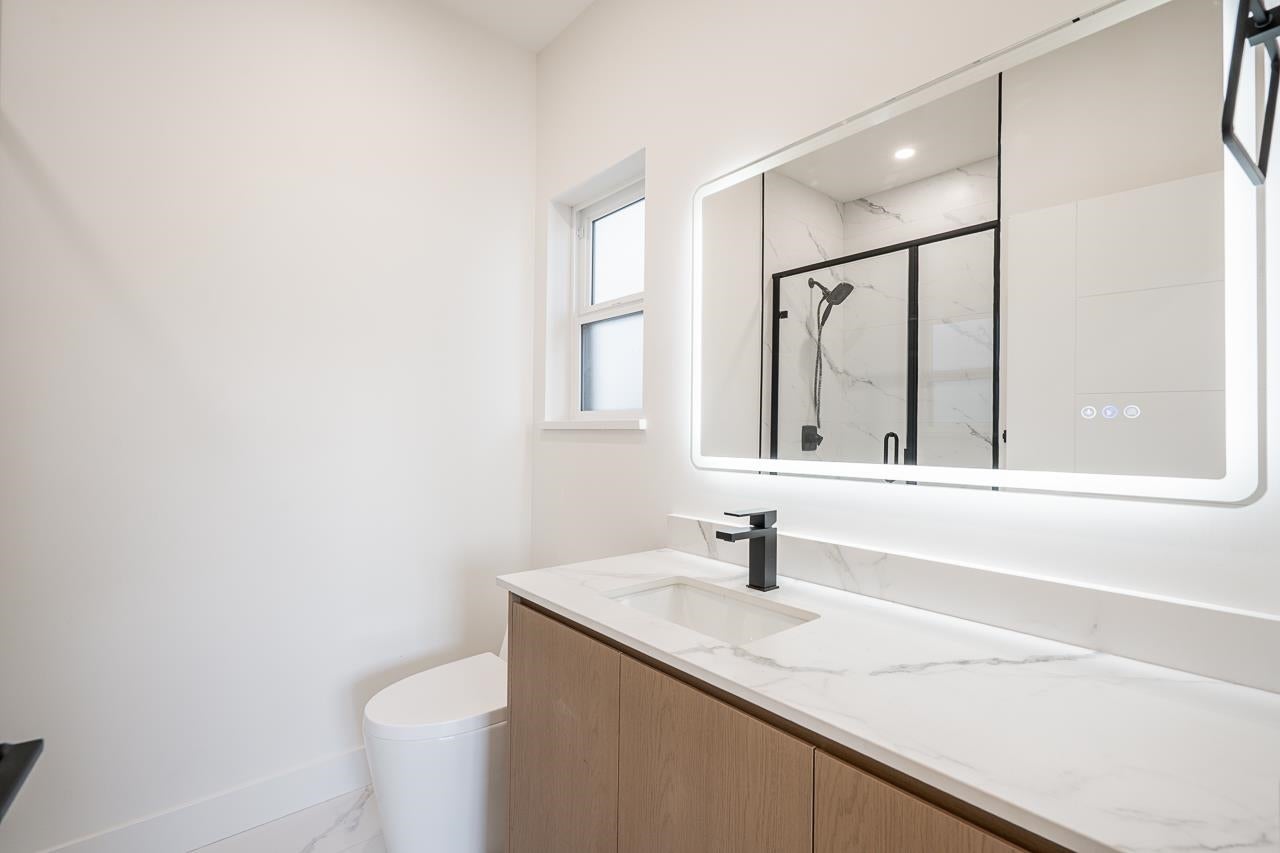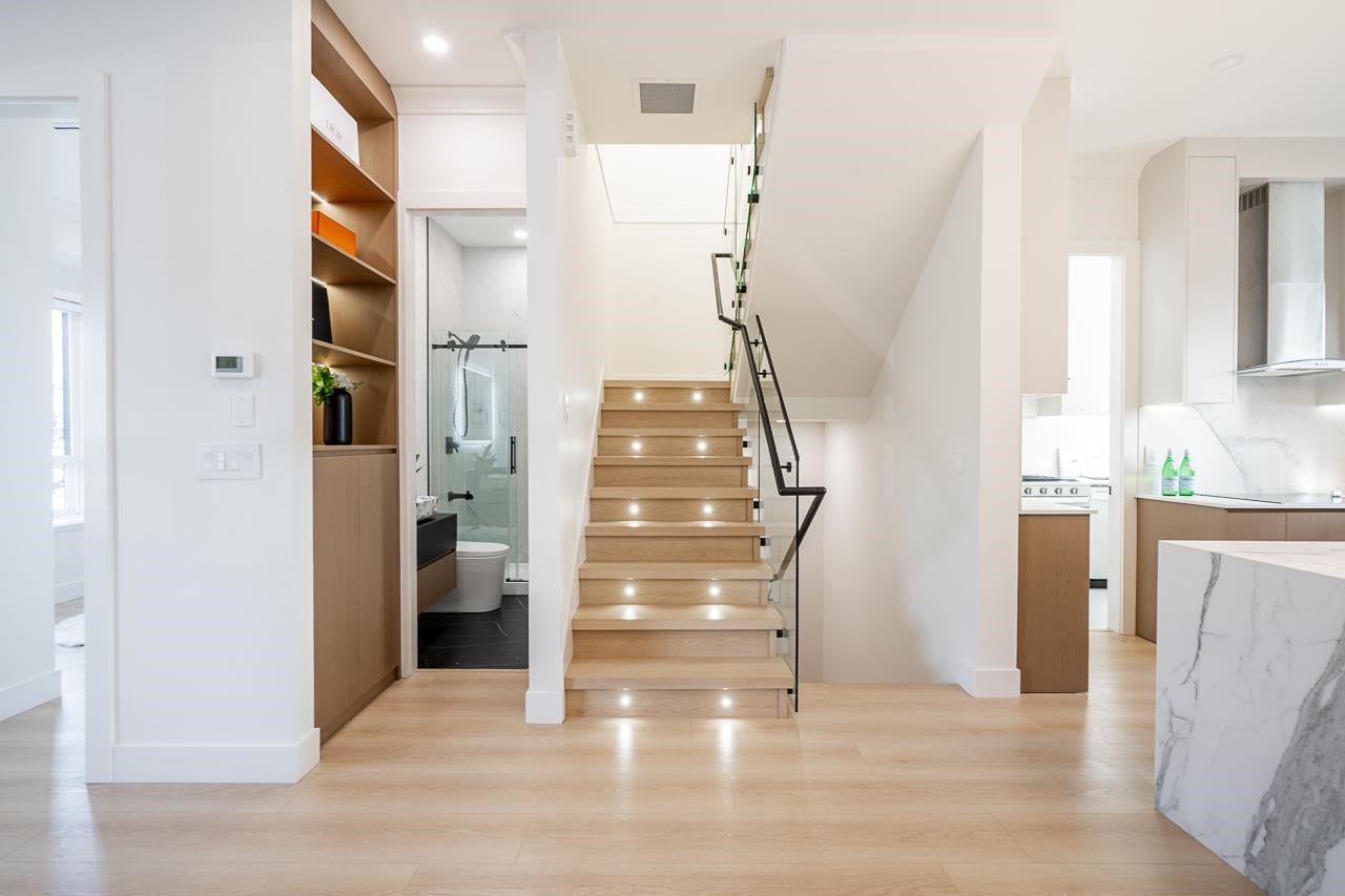 3-level modern home offering 2592sf of bright, functional living space. The open-concept main flr feat a gourmet kitchen w/quality finishes + spice kitchen, spacious living & dining areas, and cozy fireplace. A 2nd primary bdrm & full bath on the main provide an ideal setup for guests or multi-generational living. Up offers 3 bedrooms inc a generous primary suite w/W/I closet & luxurious ensuite. The ground level features a large rec room, full bath, R/I laundry & separate entry—offering excellent flexibility for extended family or future 2–3 bdrm suite potential. Designed for comfort & effic w/heat pump, A/C, HRV system, radiant h/w gas heating & security system w/cameras. Prime location close to BBY North Secondary, Aubrey Elem & short bus ride to SFU. 5 min to Brentwood and amenities!